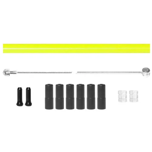 Sættet indeholder tilstrækkelig slange til, at for- og bagside kan skæres til, to galvaniserede bremsekabler med dobbelt MTB-hoved og race, 6 slangeterminaler, 2 kabelterminaler og 2 anti-vibrationsgummi.
