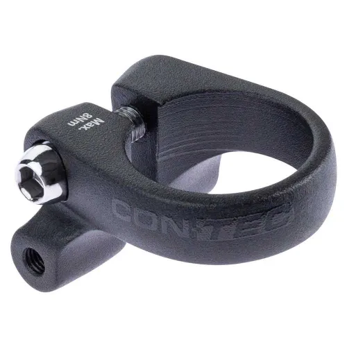 Contec Rack Support sadelklemme lavet af aluminium. Med sekskant skruestik, 12 mm høj. Yderligere skrueøjer til montering af bagagebærer.