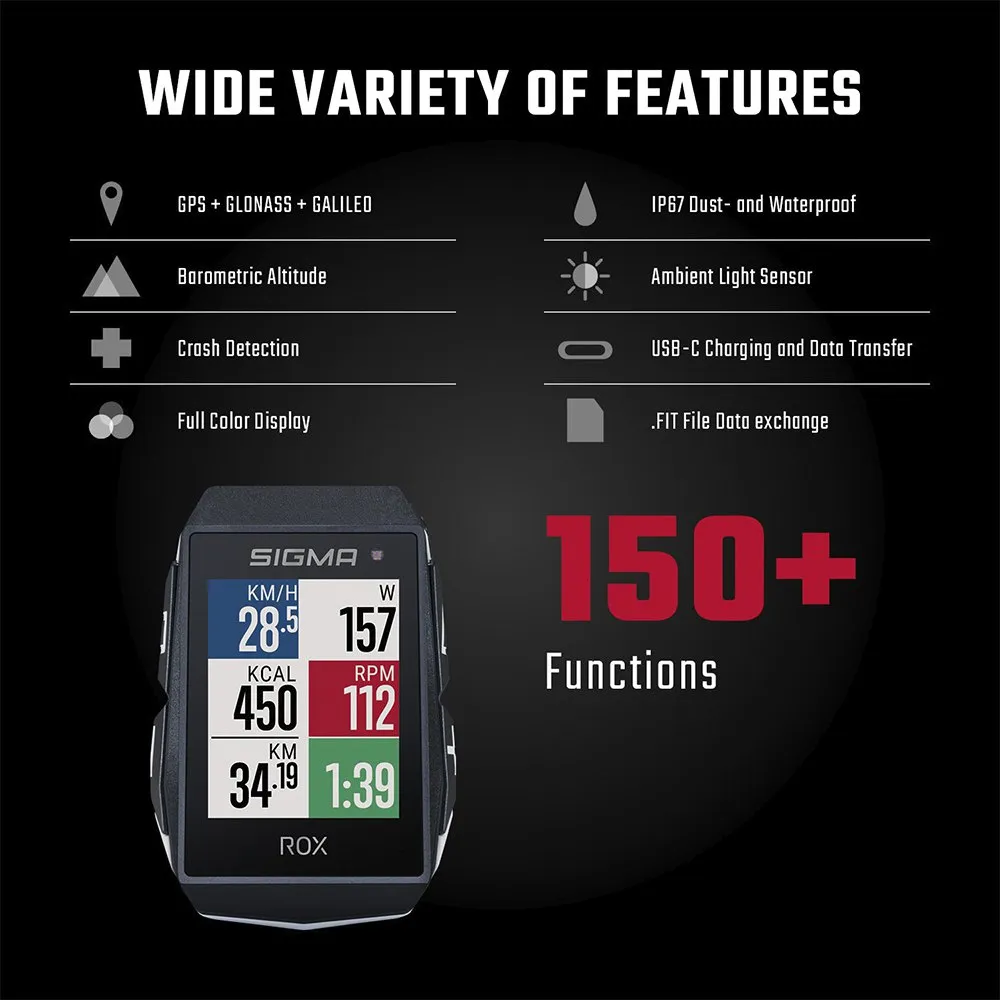 Cykelcomputerens 150 funktioner støtter og guider atleter under træning og fritid. ROX 11.1 EVO leverer alle data pålideligt og i realtid. Funktionens omfang omfatter hastigheds- og distancesporing med GPS, barometrisk højdemåling og navigation med Track eller komoot, og kompatibilitet med e-cykler og smarte trænere. Den integrerede Crash Alert-funktion bruger en app til at informere dine nødkontakter, hvis du falder af din cykel. Smart notifikationer informerer rytteren om indgående opkald og beskeder under turen.