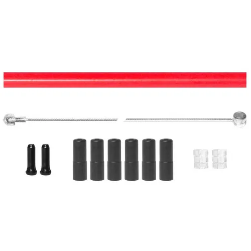 Das Kit enthält ausreichend Schlauch für Vorder- und Hinterrad zum Zuschneiden, zwei verzinkte Bremskabel mit doppeltem MTB-Kopf und -Rohr, 6 Schlauchklemmen, 2 Kabelklemmen und 2 Antivibrationsgummis.