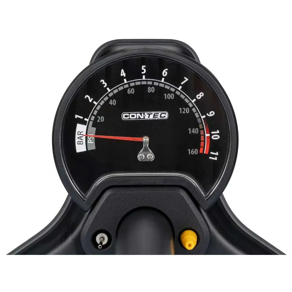 Wenige Hübe genügen, um den maximalen Druck von 11 bar oder 160 psi zu erreichen. Während des Pumpens haben Sie den Luftdruck immer im Blick – das große und gut lesbare Manometer ist eine genaue Anzeige von Bar und psi.