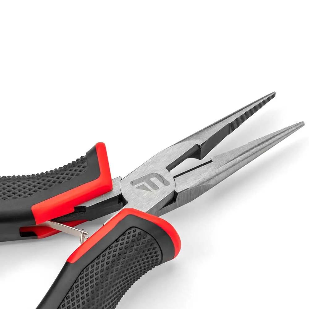 Vergessen Sie das Hantieren mit sperrigen Werkzeugen, denen es an Finesse mangelt. Diese Spitzzange verfügt über ein schlankes, längliches Zangendesign, mit dem Sie auch in enge Zwischenräume greifen und kleine Komponenten mit Leichtigkeit handhaben können. Die gezahnten Backen sorgen für einen sicheren, rutschfesten Halt, sodass Sie Drähte, Stifte und andere empfindliche Materialien sicher halten, biegen und bearbeiten können.