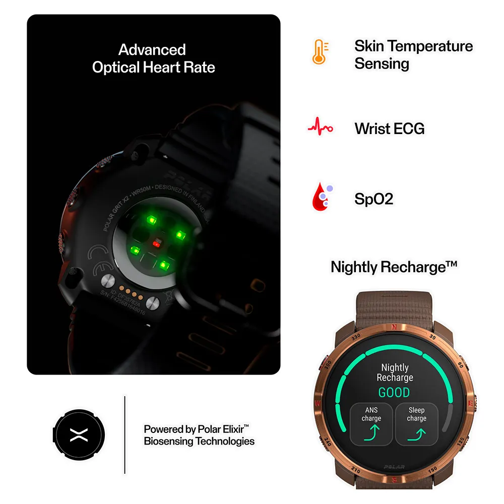 - Polar Elixir™ Biosensorik: Optische Herzfrequenz, EKG am Handgelenk, SpO2, nächtliche Hauttemperatur, HRV & Erholungs-Tracking