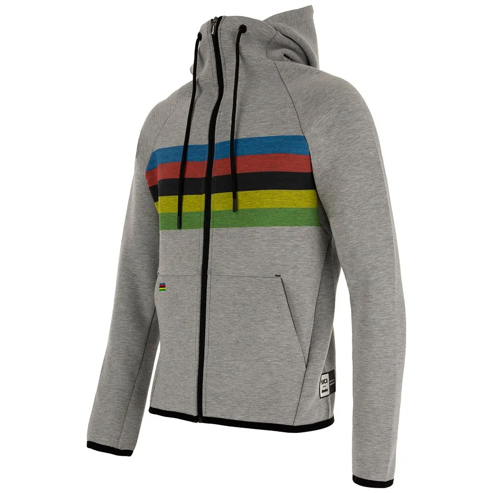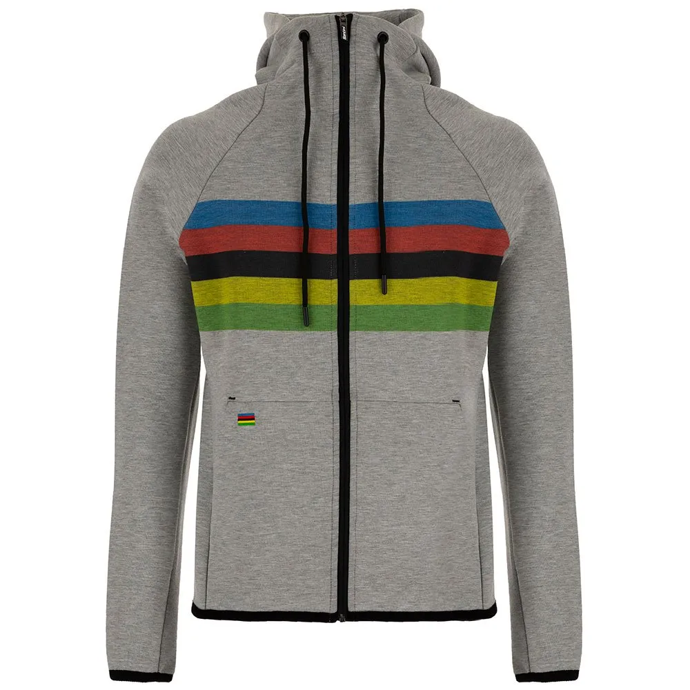Sweatshirt mit Kapuze und Reißverschluss im offiziellen, von UCI Rainbow Stripes inspirierten Design. Dies ist die perfekte Schicht für kühles Wetter, mit einem doppellagigen weichen Fleece, um die Wärme zu speichern. Die verstellbare Kapuze bietet Ihnen zusätzlichen Schutz vor den Elementen, wenn Sie sie brauchen. Rainbow Stipes auf der Brust wie das echte Weltmeisterschaftstrikot.