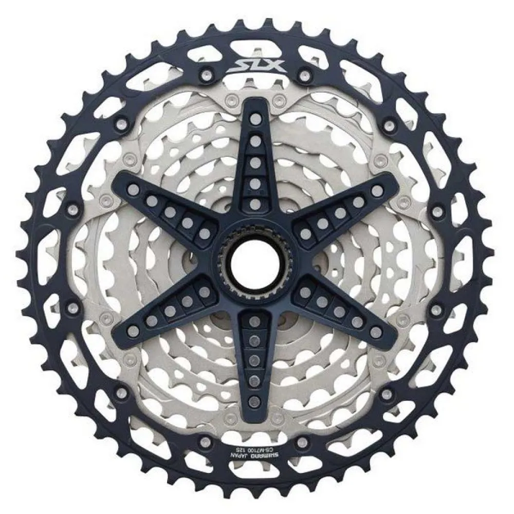 Kassette: 12-V-Kassetten. Der SLX enthält die MICRO SPLINE-Kernankertechnologie und ist in 10 45T-Ausführungen für kleinere Ritzelsprünge und 10 51D in der Entwicklung für eine größere Übertragungsreichweite erhältlich. Beide Kassetten sind mit der HYPERGLIDE + -Technologie ausgestattet, die einen schnellen und sehr leisen Wechsel ermöglicht. Die Kassetten sind mit einem Aluminium-Spider für die Aufnahme der elf Stahlkronen sowie der größten Aluminiumkrone ausgestattet, um hinsichtlich Haltbarkeit, Gewicht und Fahrstil ein optimales Ergebnis zu erzielen. Die Kassette CS M7100 12 10 51T wiegt 534 g und die Option 10 45T wiegt 513 g.