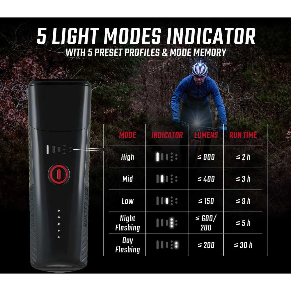 Mutige 800 Lumen und ein beeindruckender Lichtkegel von 170 Metern machen die BUSTER 800 zu einem idealen Partner für anspruchsvolle Abendfahrten. Auf dunklem, schwierigem Terrain und auf schmalen MTB-Trails spielt das BUSTER 800 seine Stärken aus. Präzise LED-Anzeigen auf der Oberseite zeigen auf einen Blick den Batteriestatus und welcher der fünf Lichtmodi ausgewählt ist. Das BUSTER 800 ist in zwei Versionen erhältlich: eine am Lenker und eine am Helm (HL).