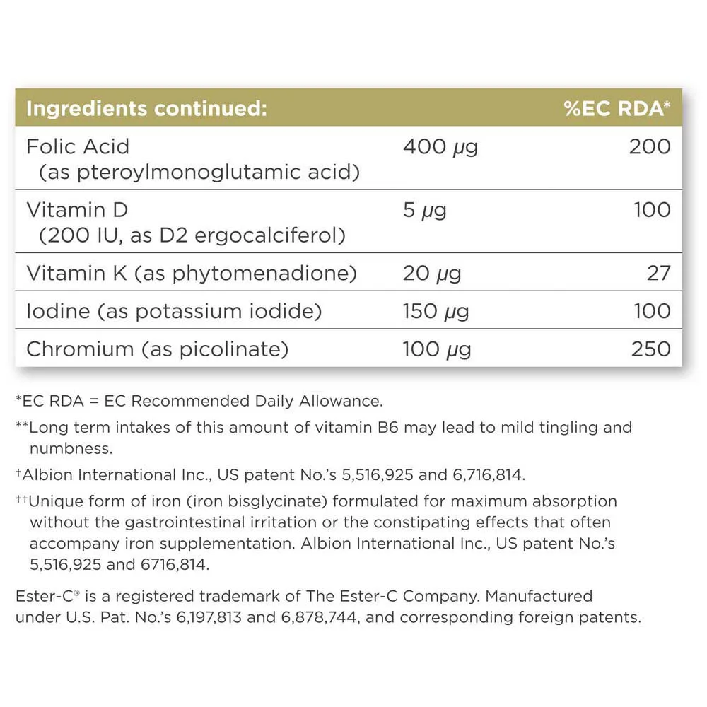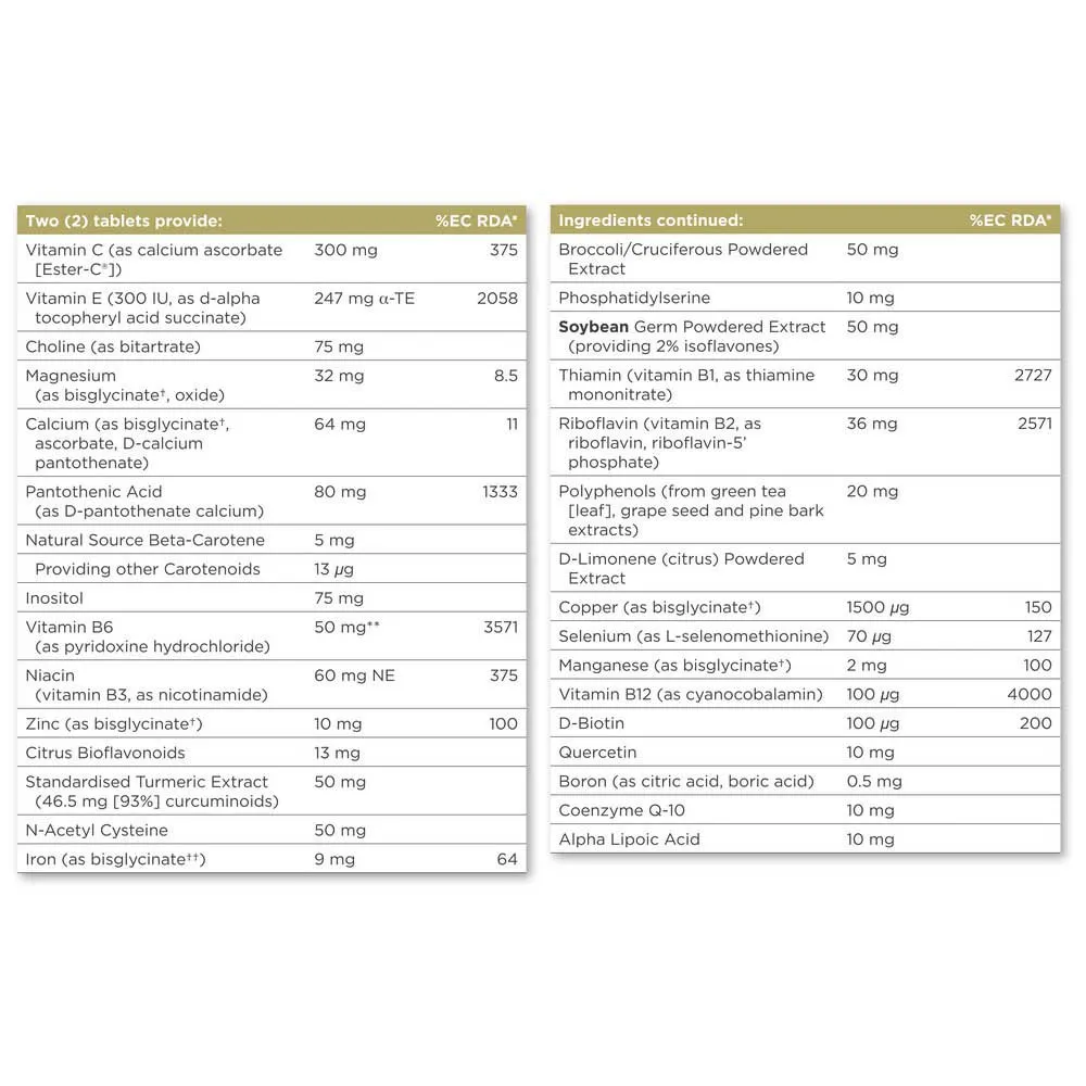 Inhaltsstoffe: Füllstoffe: mikrokristalline Cellulose, Erbsenstärke, Alginat, Dicalciumphosphat, Zitronensäure, Maltodextrin, Mannit, Vitamin C (als Ester C®, Calcium L Ascorbat), Cholin (als Bitartrat), Antibackmittel: pflanzliche Stearinsäure, pflanzliches Magnesiumstearat, Siliziumdioxid, Calcium (als Bisglycinat, Ascorbat), Glasiermittel: Hydroxypropylcellulose, pflanzliches Glycerin (aus Palmkernöl und Kokosöl), Magnesium (als Bisglycinat, Oxid), vernetztes Cellulosegummi, Pantothensäure (als D. Pantothenat, Kalzium), Inosit, Vitamin E (90 IE als d alpha Tocopherylsäuresuccinat), Niacin (Vitamin B3, als Nikotinamid) Standardisierter Kurkuma (Curcuma longa) Wurzelextrakt, Brokkolipulver, Sojabohnenkeimpulver-Extrakt (mit 2% Isoflavonen) , Riboflavin (Vitamin B2, als Riboflavin, Riboflavin 5´-Phosphat), Thiamin (Vitamin B1, als Thiaminmononitrat), Polyphenole (aus Grünteeblatt- und Traubenkernextrakten), Farben: Anthocyane (aus Traubenschalen (Sulfite)), Titan Iumdioxid, Eisen (als Bisglycinat), Phosphatidylmischung (Phosphatidylserin, Phosphatidylcholin), Vitamin B6 (als Pyridoxin-HCl), Zink (als Bisglycinat), Quercetin (als Quercetin-Dehydrat), Alpha-Liponsäure, Coenzym Q 10, Citrus-Bioflavon Komplexe, natürliche Quelle Beta-Carotin, Mangan(als Bisglycinat), Kupfer (als Bisglycinat), Chrom (als Picolinat), Folsäure (als Pteroylmonoglutaminsäure), Carotinoidmischung, Jod (als Kaliumiodid), Selen (als L-Selenomethionin), D-Biotin, Vitamin B12 (als Cyanocobalamin) ), Vitamin K (als Phytomenadion), Vitamin D (200 IE, als D2-Ergocalciferol) ,.
