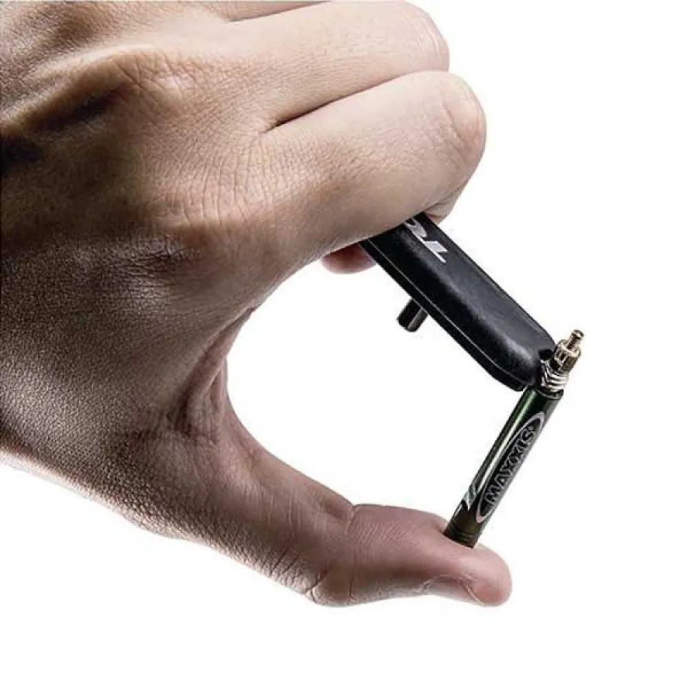 Ein integriertes Presta-Ventilwerkzeug, das für Tubeless-Reifenbenutzer unerlässlich ist, um Ventileinsätze beim Hinzufügen von Dichtmittel oder beim Aufziehen eines Reifens festzuziehen oder zu entfernen.