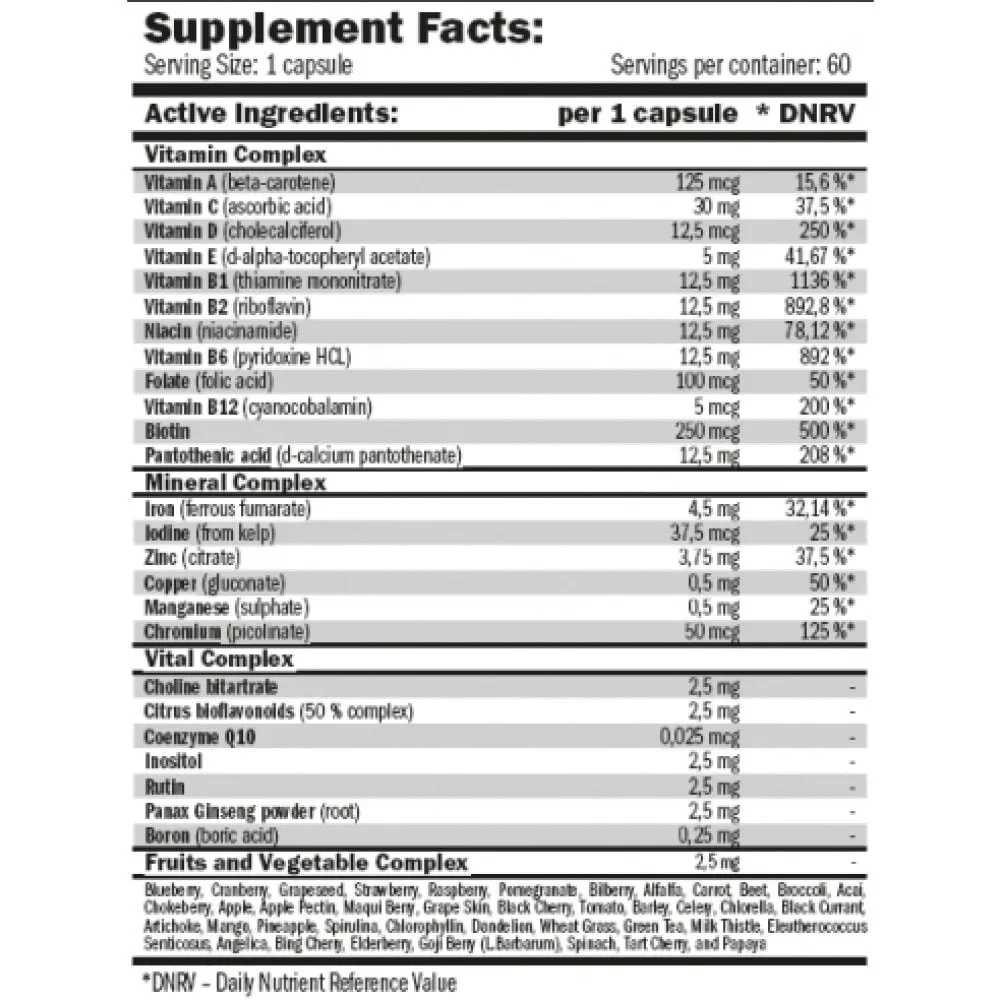 Amix ™ multi-hd liquid caps contains high amounts of group b vitamins, essential in protein and carbohydrate metabolization, of great importance for professional and amateur athletes that follow specific diets and training. It also contains antioxidants (such as coenzyme q10), bioflavonoids (such as routine) and a very complete fruits and vegetable complex (including: blueberries, grape seed, raspberry, tomato, handle, handle, pineapple, spirulin, green tea, goji berries , spinach and a long etcetera ...) therefore amix ™ multi-hd liquid caps provides you with a complete multivitamine-mining , very intense training, etc. Main benefits of amix ™ multi-hd liquid caps:- basic supplement for sports practice.- strengthens the immune system.- better absorption and greater efficacy thanks to licaps® technology.- fruit and vegetable complex. Additional informationamix ™ multi -hd liquid caps continues at the forefront of sports supplementation using the most advanced technology in the elaboration of our products, such as the encapsulation of liquid substances in licaps® (hard gelatin capsules). Licaps® guarantees an immediate effect and maximum reabsorption, since liquid ingredients are absorbed much more easily in the human body (up to 3 times faster than tablets and 2 times faster than the dust of conventional capsules), providing results much faster and more effective. This new technology also guarantees that the ingredients are 100% pure and fresh. Rice bran intregueite, gelatin capsule (gelatin, dye: chlorophyll); ascorbic acid (vit. C), calcium carbonate (calcium), mononitrate thiamine (vit.b1), riboflavin (vit. B2), niacinamide (niacin), hcl pyridoxin (vit. B6), d-calcium d-paterottenate (pantotenic acid ), potassium citrate (potassium), magnesium oxide (magnesium), selenium yeast (selenium), d-alpha-tocoferol acetate (vit. E), ferrous fumarate (iron), zinc citrate (zinc), bitterotrate of hill, 50% complex citrus biofonoids, inositol, routine, panax powder ginseng (root), fruits and plant complex (blueberry, blueberry, grapes, strawberry, raspberry, grenade, blueberry, alfalfa, carrot, beet, broccoli, acai, chokeberry, from apple, apple pectina, maqui berry, leather grape, black cherry, tomato, cess , eleutherococcus senticosus, angélica, bing cereza, baya del saúco, goji berry (l.barbum), spinach, cherry and papaya cake); copper gluconate (copper), manganese sulfate, biotin, boric acid (boron), beta-carotene (vit. A), folic acid, chrome picolinea (chrome), algae iodine, cholecalciferol (vit. D), cyanocobalamine (vit. B12), the coenzyme q10; employment mode 1 cap. 1-3 times a day with meals. Take abundant water. 60 capsules boots.