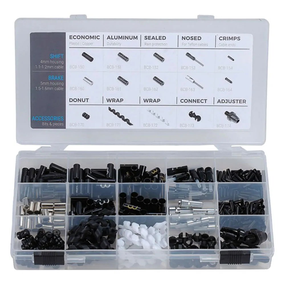 * Kit Contents: A comprehensive assortment including sealed ferrules for shift housing, standard ferrules for brake housing, and protective cable end caps (crimps).