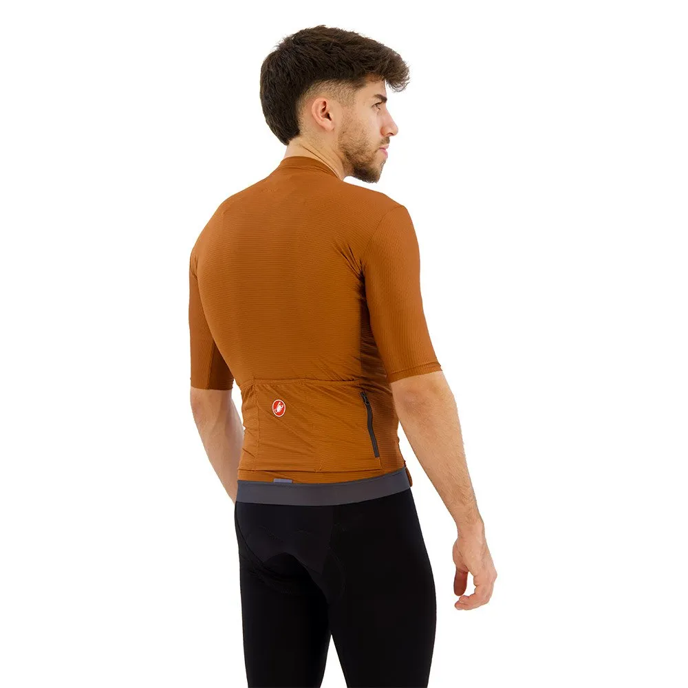-Castelli engineered Air_O Stretch fabric for breathability, comfort and perfect fit Fabric optimized for breathability and aerodynamics Raw-cut sleeve endings for comfort Three back pockets with fourth zippered security pocket for valuables Full-length YKK® Vislon® zipper with easy-use zipper pull Elastic at waist with silicone to keep jersey in place Reflective tab for added visibility.