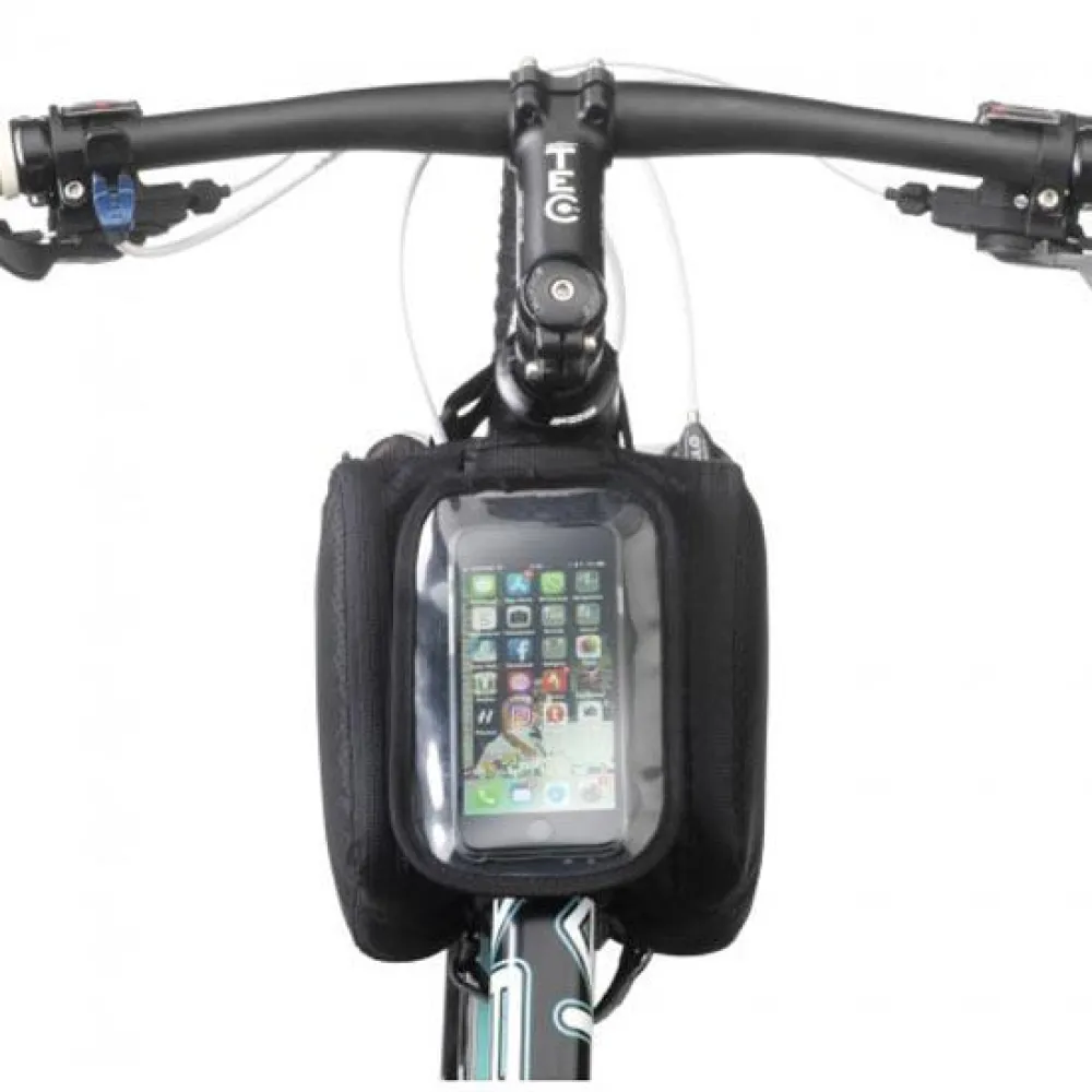 Bag for bike frame behind the stem. Light, it has two 1l.zippered front pockets and a smartphone pocket on top with touch screen window.