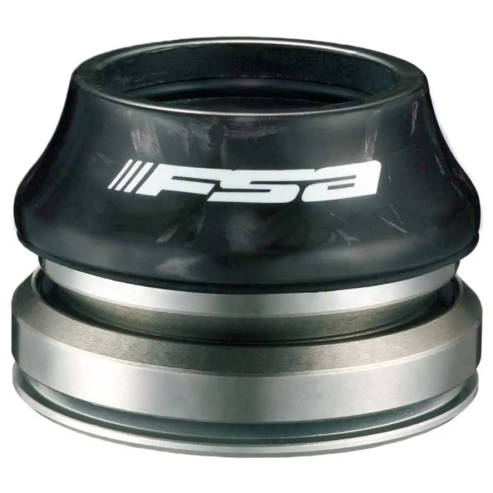 The FSA N.44E/CF Carbon steering system is an integrated headset, which means the bearings sit directly inside a compatible head tube for a clean, seamless look and reduced stack height. It features a premium carbon top cover for a professional aesthetic and weight reduction, along with dependable Angular Contact Bearings for optimal performance. This model is specifically designed for frames with a tapered head tube, ensuring a perfect fit and maximum stiffness for modern bicycle frames.