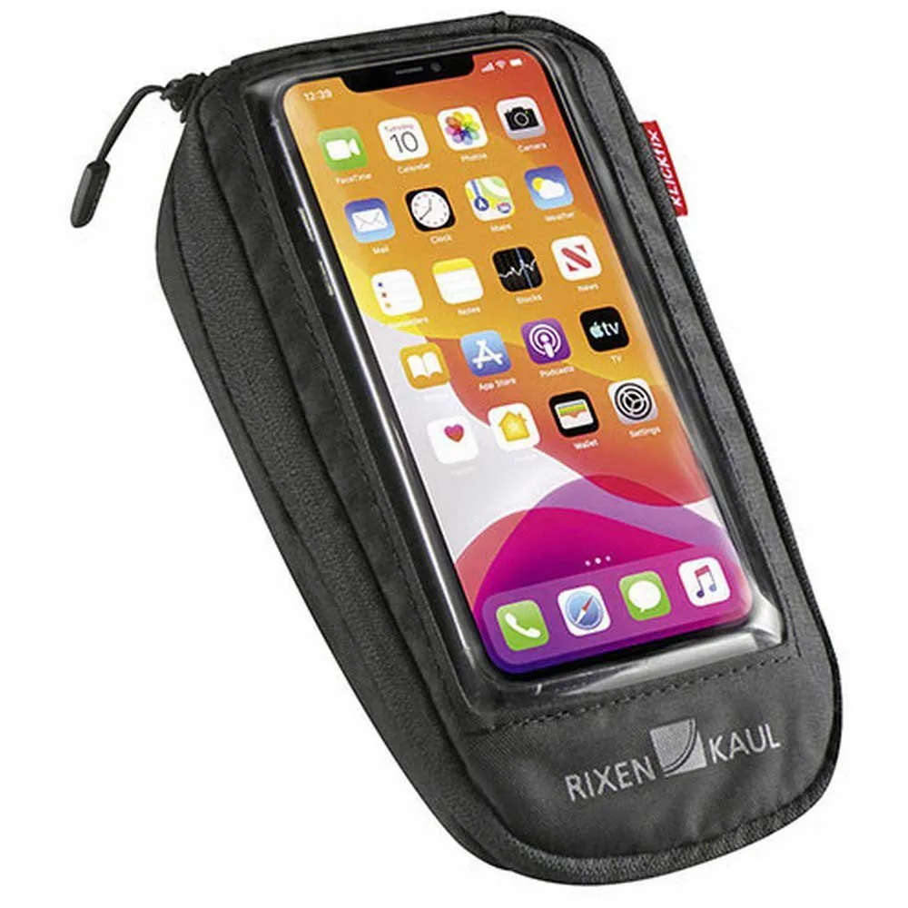 Sewn smartphone bag with extra storage and folding lid with zipper. for bigger smartphones up to 8,5x16,5cm. the easily accessible extra compartment offers additional storage space for glasses, wallet or an additional battery. the smartphone is inserted from the inside and can be operated through the foil. easily changes from vertical to horizontal orientation.