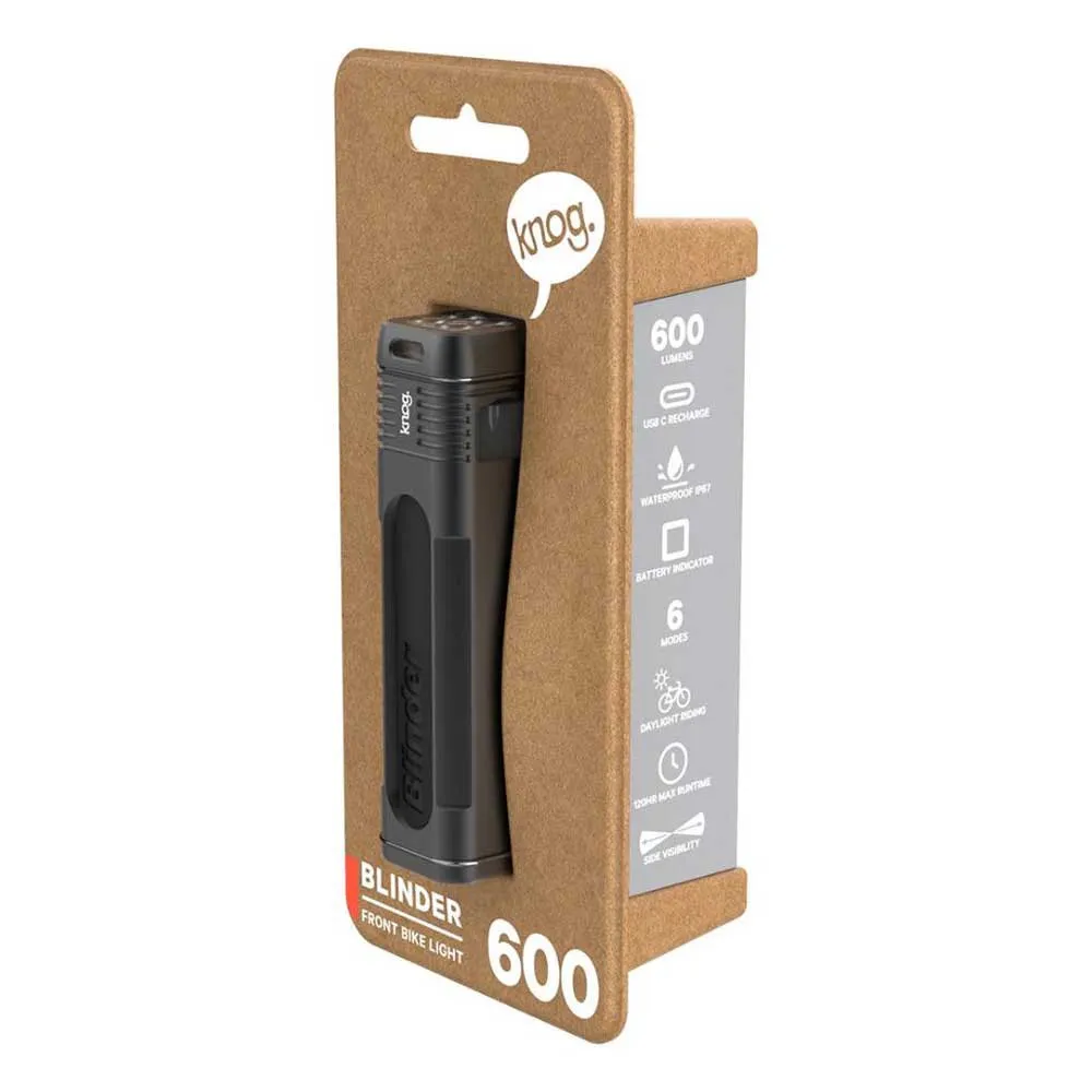 Illuminate your ride with the KNOG Blinder 600, the perfect front light for discerning urban cyclists. It packs a powerful 600-lumen, road-focused beam into a compact, robust CNC-built body, lighting your path up to 80m. Enjoy 2 hours on full brightness or up to 120 hours in Eco flash mode. With 6 modes, a versatile mount for over/under bar placement, side illumination for extra safety, and an IP67 waterproof rating, this USB-C rechargeable light is built to perform. The intelligent button shows battery status at a glance, ensuring you´re always ready to ride