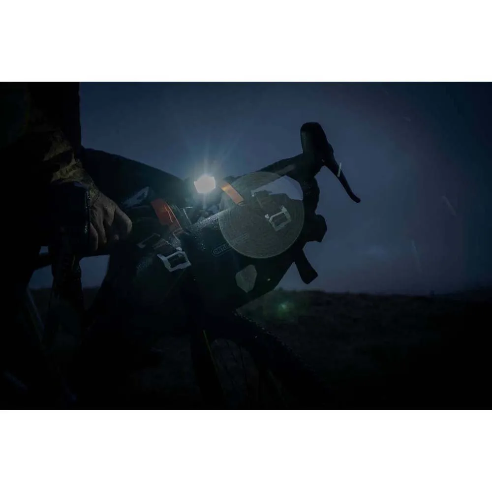 Compact front light shining bright on the road and making you well visible for the traffic. You can set up different levels of brightness up to 300 lumens or switch it to flashing mode. Thanks to its silicone holder you will attach it in the dark with your left hand.