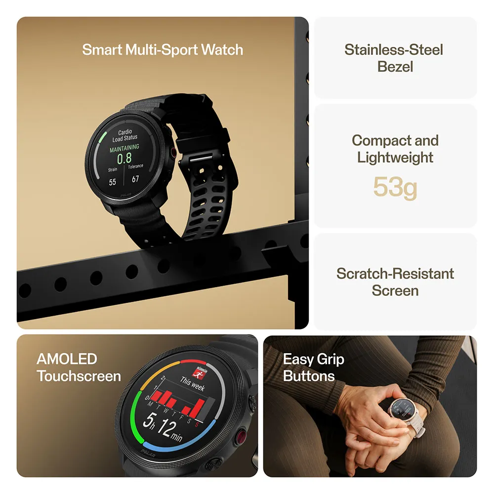 Unleash your potential with the POLAR Vantage M3. This sleek, lightweight watch features a stunning AMOLED touchscreen and stainless steel bezel. Dive deep into your body’s data with groundbreaking Polar Elixir™ biosensing, offering Wrist-ECG, SpO2, and skin temperature tracking. Navigate confidently with dual-band GPS and offline maps. Crush your goals with Smart Coaching, personalized training plans, and advanced sleep & recovery analysis. With up to 7 days of battery life, the Vantage M3 is the ultimate tool to train smarter and live better