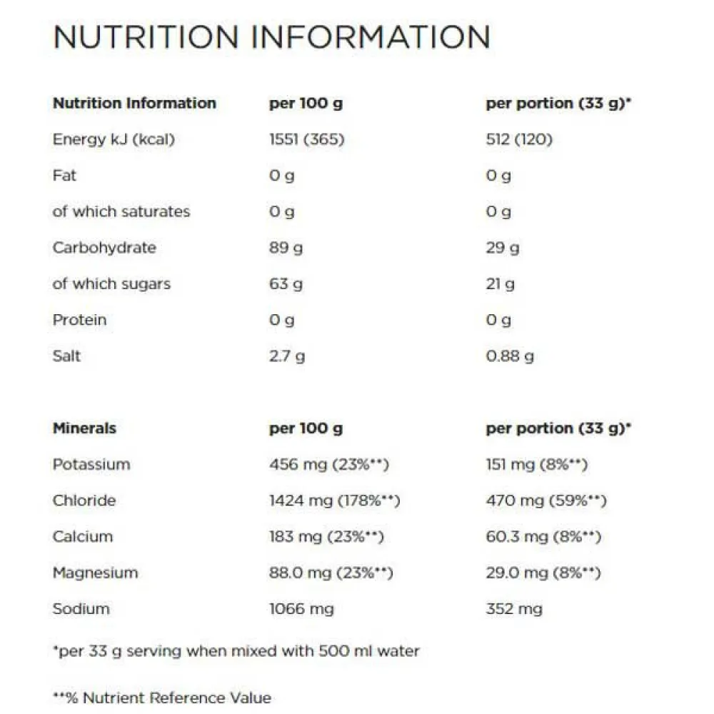 Dextrose, maltodextrin, fructose, minerals (sodium citrates, sodium chloride, calcium lactate, potassium chloride, magnesium carbonates), acidity regulator (citric acid), natural flavourings, beetroot juice powder. May contain traces of soybeans and milk.