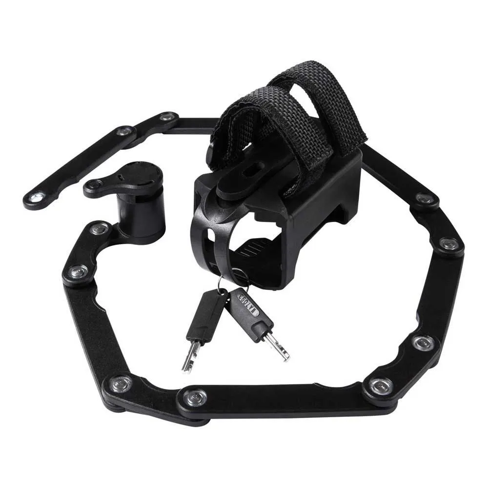 High security meets convenience in this 900 mm folding lock with a particularly handy small pack size. The synthetic coating prevents corrosion and protects the frame against scratches. Includes two keys and bracket.