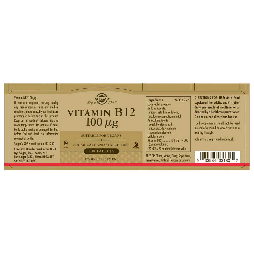 Solgar Vitamin B12 100 mcg comes in a tablet form. Vitamin B12 also known as cobalamin, is the only vitamin containing cobalt, a trace mineral that is necessary for the formation of red blood cells. It also plays a number of different roles in the body such as reducing tiredness and assisting in the release of energy from foods.