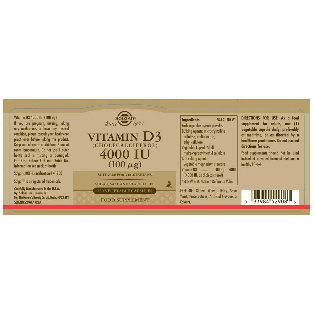 Solgar® Vitamin D3 (Cholecalciferol) 4000 IU (100 µg) Vegetable Capsules is a premium formula delivering vitamin D in the form that is easiest to use by the body - D3.