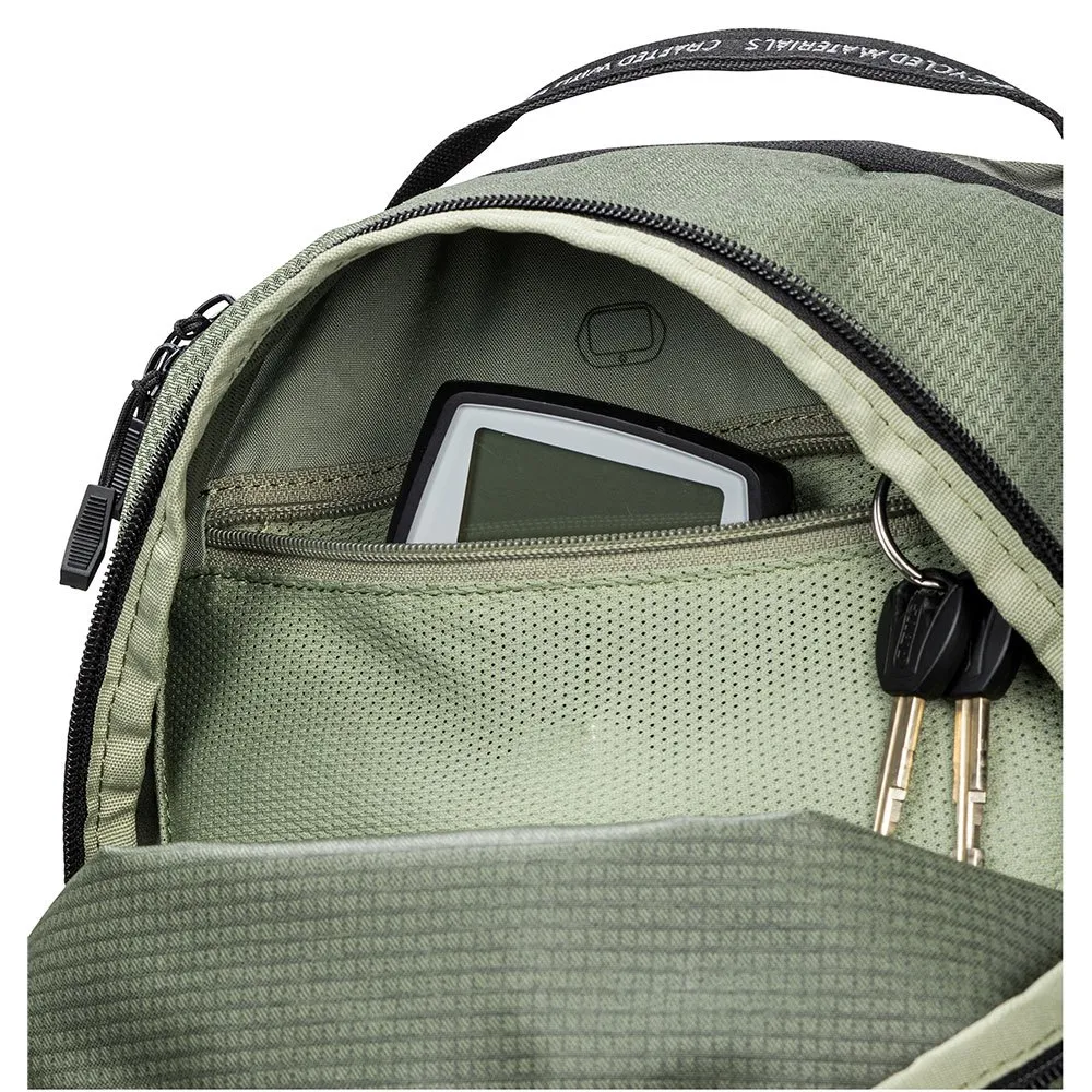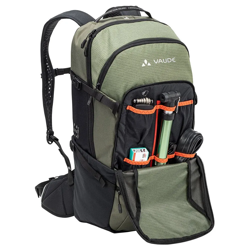 Conquer any e-mountain bike tour with the VAUDE eMoab 22! This feature-packed 22L backpack is designed for comfort and organization. A dedicated compartment secures your spare battery, while the Vent Active suspension and Ergoshape straps provide a perfect, stable fit with excellent ventilation. Keep gear organized with a large main compartment, a front tool pocket, and a removable hydration bladder section. Made primarily from recycled materials with an eco-friendly finish, it´s the smart, sustainable choice for long rides. Includes a helmet holder and rain cover