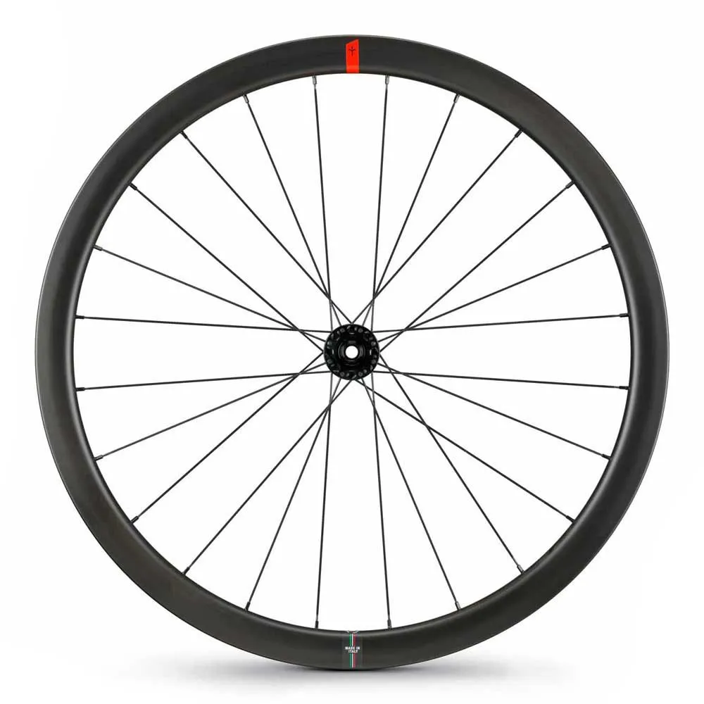 The wheel features a 38mm deep and wide rim that is optimized for aerodynamics and stability. The rim is made of high-quality carbon fiber, which is rigid and lightweight, allowing for superior power transfer and acceleration. The rim is also tubeless-ready, offering increased comfort and reduced rolling resistance.