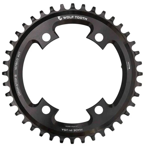 - Drop-Stop technology prevents dropped chains. On Wolf Tooth’s patented wide/narrow chainring, the wide side of the tooth has maximum contact on the drive side which spreads the load and improves chainring life. The narrow side allows clearance for mud and debris while reducing friction.