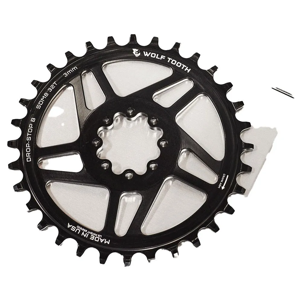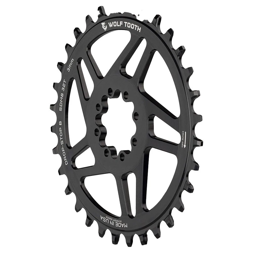 Wide/narrow tooth profile:Wolf Tooth´s patented Drop-Stop® for maximum chain retention and mud shedding capacity.