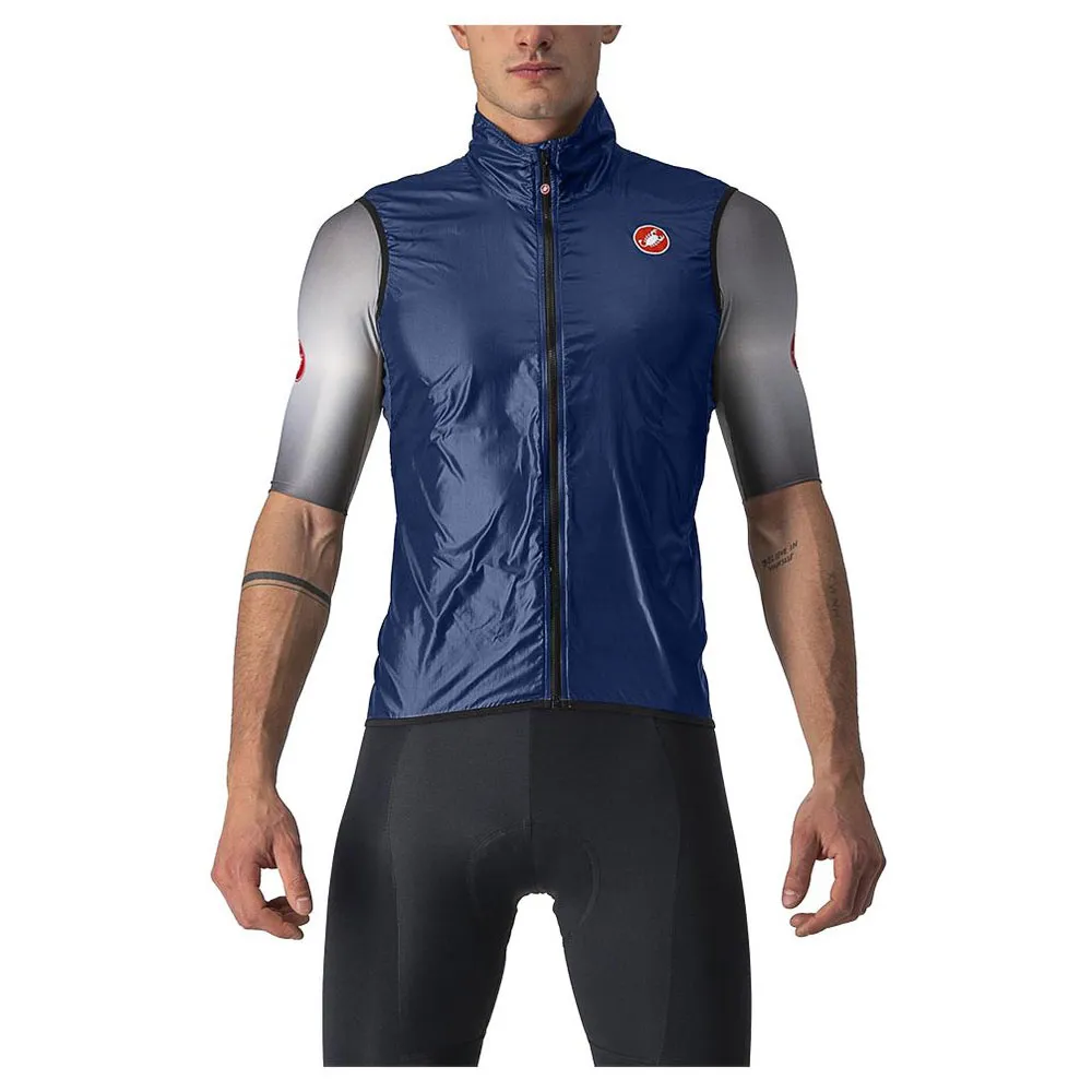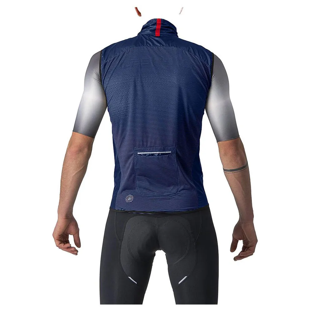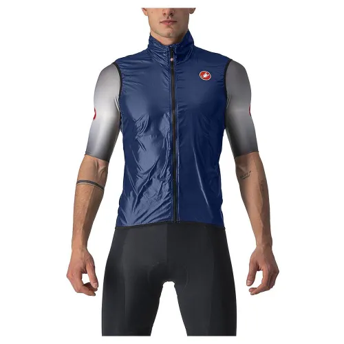 Calidad Castelli. Un chaleco compacto y práctico. Acabado estilo bolsa de basura con cremallera.