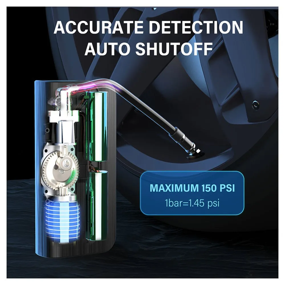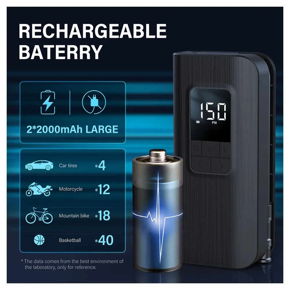 150 PSI Y INFLADO RÁPIDO: Equipado con una batería recargable de 2 * 2000 mAh, el inflador de neumáticos portátil puede inflar neumáticos hasta 150 psi / 10,3 bar. El potente motor de esta bomba de neumáticos para bicicleta permite un inflado rápido: 8 minutos para un neumático de automóvil, 2 minutos para un neumático de bicicleta y 1 minuto para una pelota. Nota: no apto para neumáticos de 4x4, camiones, vehículos, colchones de aire o botes inflables.