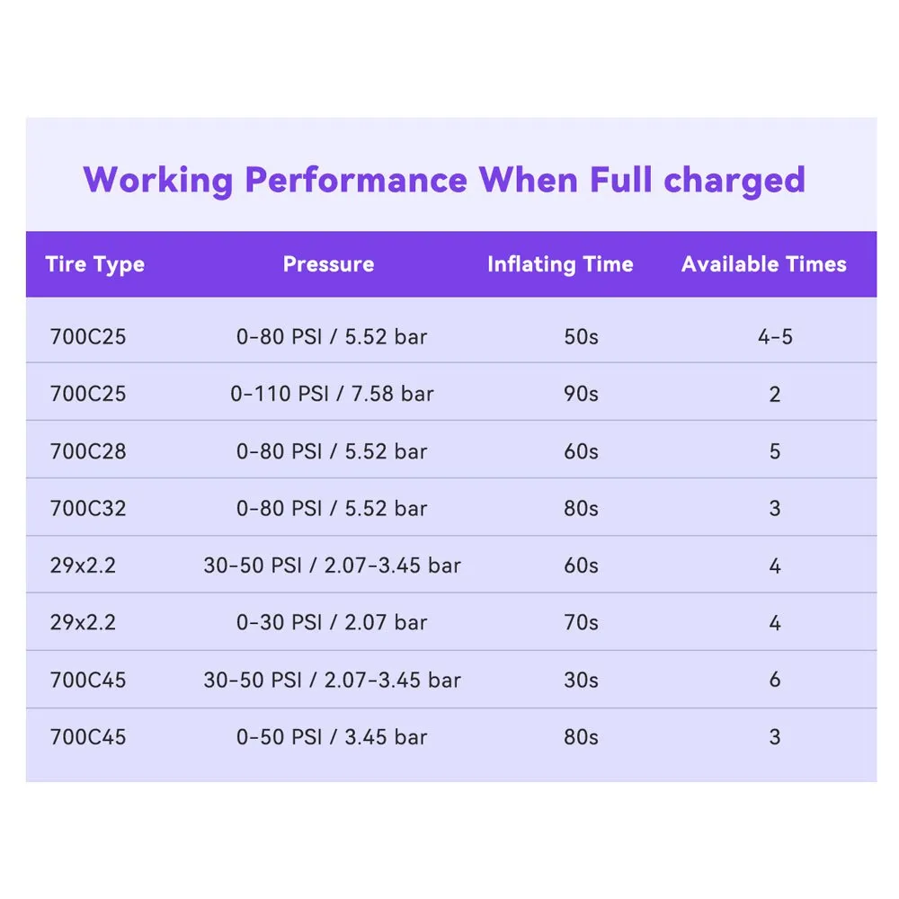 Carga rápida: Solo una hora para cargarse completamente. Con una carga completa, puede inflar al menos tres neumáticos 700*25C de 0 a 120 PSI.