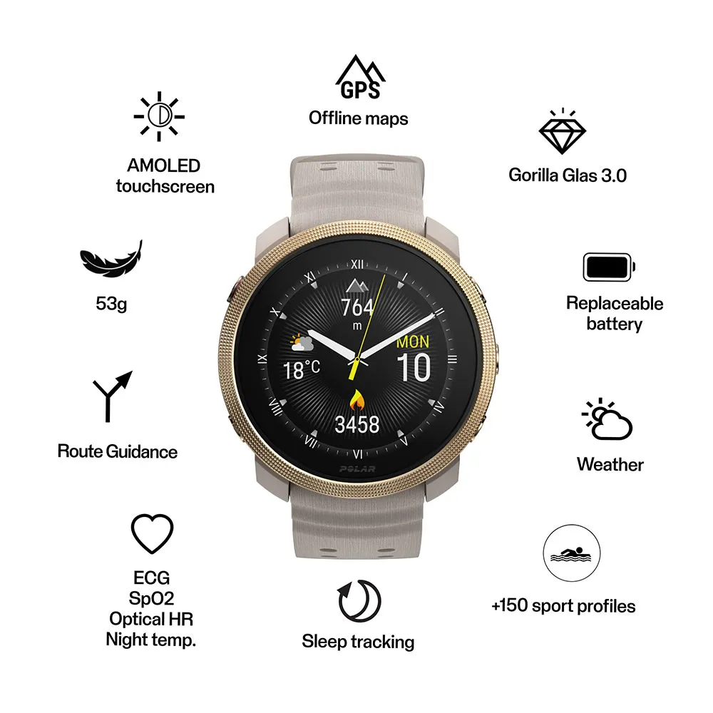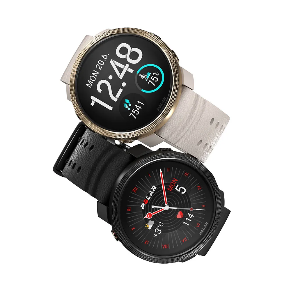 - ECG de muñeca: Coloca el dedo en el botón de desbloqueo para obtener un ECG en cuestión de segundos, en cualquier momento y lugar, y accede a datos adicionales sobre tu salud cardiovascular y tu recuperación. La función de ECG te permite ahora realizar una prueba ortostática sin necesidad de un monitor con banda pectoral. El ECG de muñeca te permite registrar los latidos de tu corazón y la variabilidad de la frecuencia cardíaca para ayudarte a determinar el equilibrio entre el entrenamiento y la recuperación.