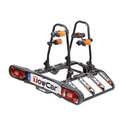 El portabicicletas sobre bola de enganche Towcar T4 es abatible para poder acceder al maletero con las bicicletas cargadas. Tiene antirrobo de bicicletas y de portabicicletas. Conexión eléctrica de 7 y 13 polos. Las bicicletas se fijan al portabicis mediante pinzas de silicona que no dañan ni rayan el cuadro de la bicicleta. Dimensiones (cm): 108x95x70 cm. Dimensiones plegado (cm): 95x98x32 cm. Las ruedas se sujetan al portabicis con correas de seguridad. Pilotos plegables. Soporta un peso de 60 kilos. No es válido para transportar bicis eléctricas. La placa V20 es obligatoria en toda la gama de portabicicletas de portón y enganche. Homologación CE. No es necesario pasar ITV. Por normativa de la DGT es obligatorio llevar visible la placa de señalización de carga saliente V20.