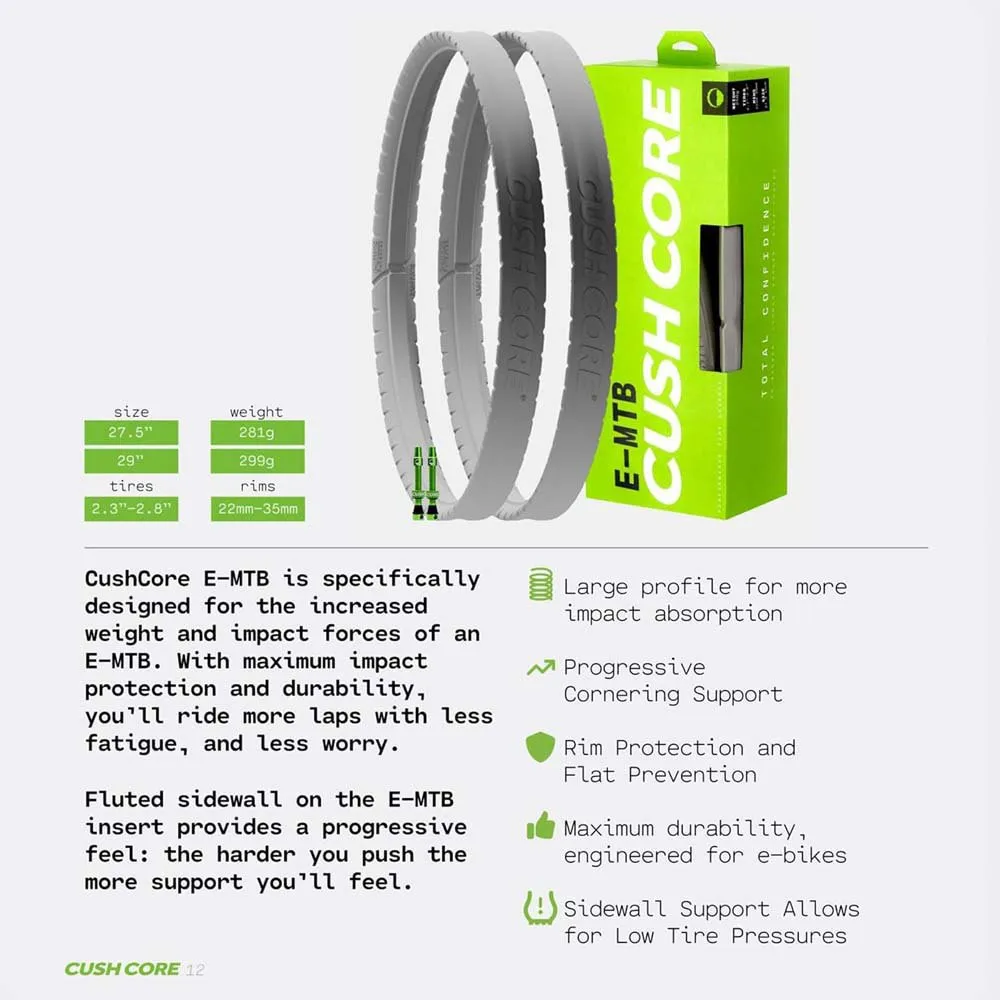 Sano hyvästit pinnaamalla syntyvien puhkeamisten ja katastrofaalisten vanteiden vaurioiden aiheuttamalle ahdistukselle. CushCore E-MTB -insertti toimii vahvana, suojaavana esteenä renkaan sisällä, vaimentaen voimakkaimmat iskut kivistä, juurista ja teräväreunaisista osumista. Tämä on erityisen tärkeää sähköpyörien lisäpainon ja suurempien voimien vuoksi, tarjoten ratkaisevan puskurin, joka säästää kalliit vanteesi kolhuilta ja halkeamilta, jolloin voit ajaa teknisten osuuksien läpi epäröimättä.