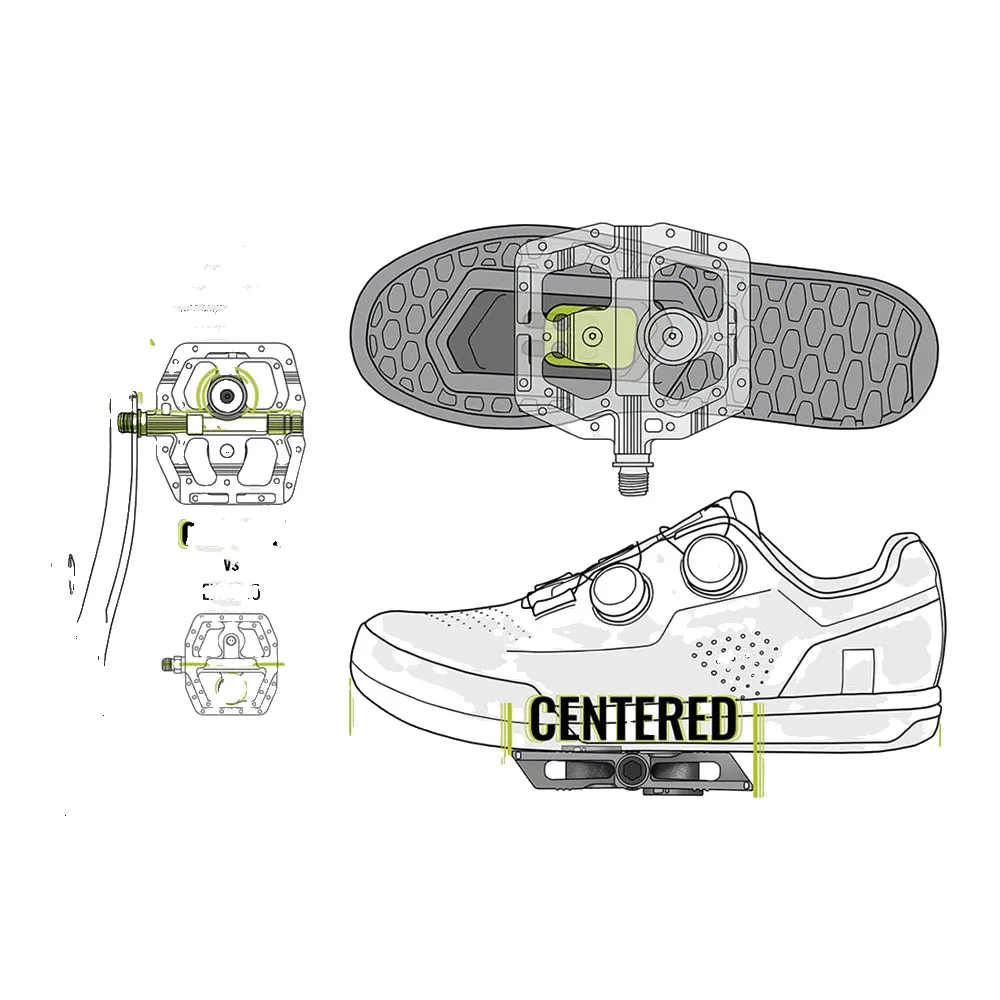 Cette conception innovante permet une position du pied centrée, exactement là où vous voulez être lorsque vous abordez des descentes raides et des éléments techniques.