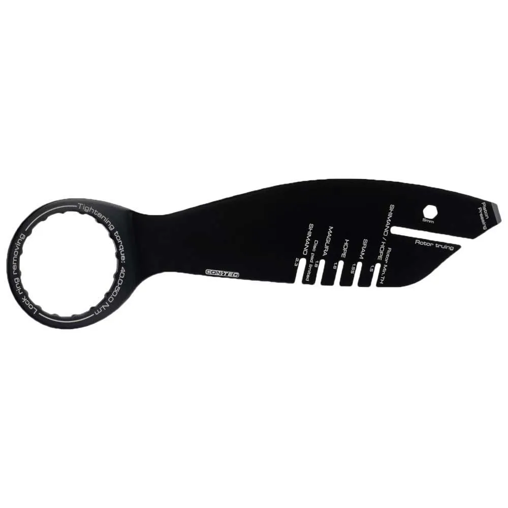 Un multiutensile per tutto ciò che riguarda il rotore: con il CONTEC TFP Shark hai in mano più di un semplice indicatore di usura per i dischi freno. Oltre a misurare i limiti di usura per rotori e pastiglie, questo strumento ha anche una chiave per anelli di bloccaggio, uno strumento per raddrizzare i dischi freno per raddrizzare i dischi piegati, nonché uno spingipistone del freno e un´estensione della chiave per esagono da 5 mm per una maggiore leva.