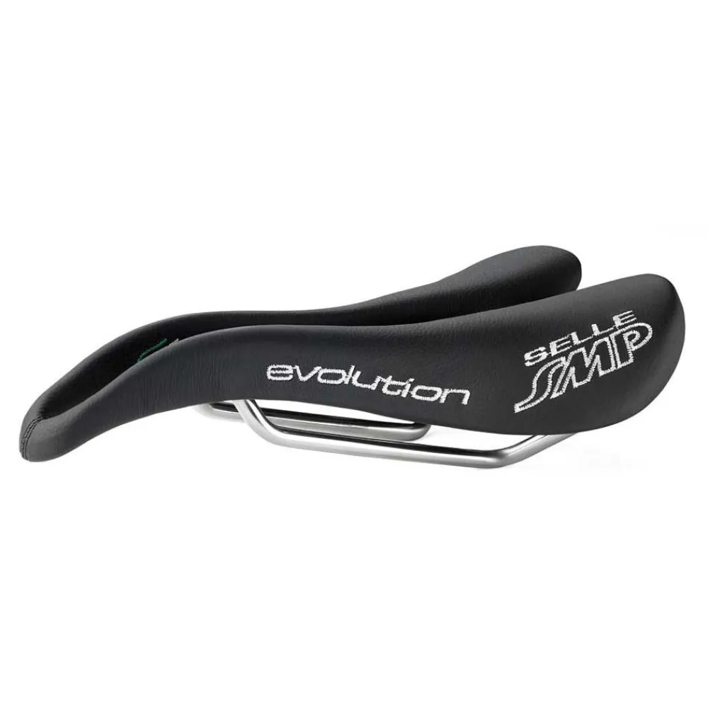 Il modello EVOLUTION è la sella ideale sia per le competizioni sportive che per le pedalate nel tempo libero. Utilizza la struttura del modello Composit completata da una ridotta imbottitura. E rivestita in Vera Pelle per le versioni di colore nero e Microfibra per le versioni colorate Presenta caratteristiche allround ottimali ed è particolarmente idonea per i bacini dalla conformazione anatomica nella media. Il modello EVOLUTION è imbottito in elastomero espanso in corrispondenza dei punti di appoggio di tuberosità ischiatica e glutei. Le caratteristiche brevettate di Selle SMP quali il canale centrale completamente libero, l?originale nasello a becco d?aquila e l?innalzamento della porzione posteriore, conferiscono a questi modelli un interessante tocco di aerodinamicità. In virtù della sua imbottitura minimale è particolarmente adatta per le persone magre con bacino stretto.