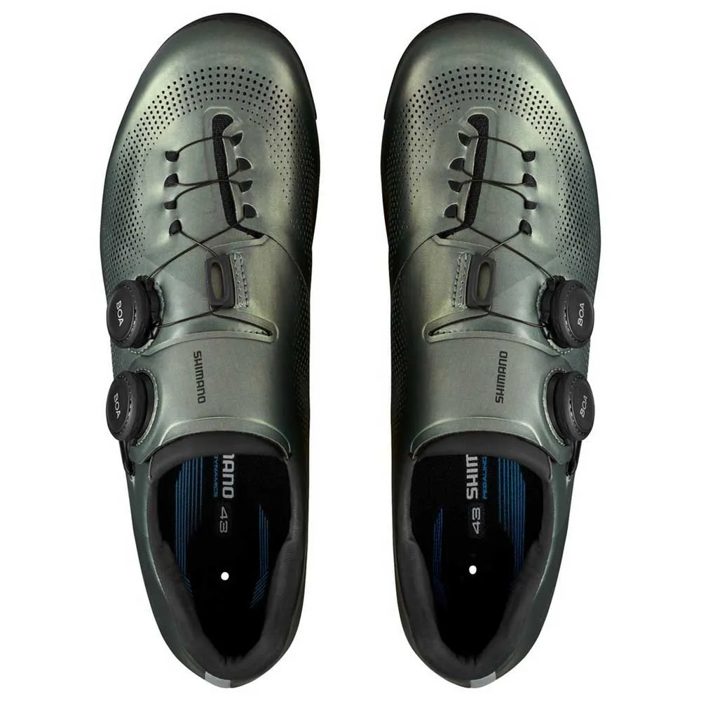 Scarpe da strada competitive infuse con il DNA S-Phyre. L´RC703 offre prestazioni d´élite con la sua suola in carbonio ultra-rigida e cava (rigidità 10) per il massimo trasferimento di potenza. Sperimenta una calzata superiore, avvolgente come un guanto, grazie alla tomaia senza cuciture che avvolge il piede e ai precisi doppi registri BOA® L6. La tecnologia Shimano Dynalast favorisce una pedalata più fluida ed efficiente, mentre le prese d´aria integrate e i fori di drenaggio mantengono i tuoi piedi freschi e asciutti. Leggere, stabili e costruite per la velocità, queste scarpe sono progettate per aiutarti a superare i tuoi limiti ed eccellere in ogni uscita
