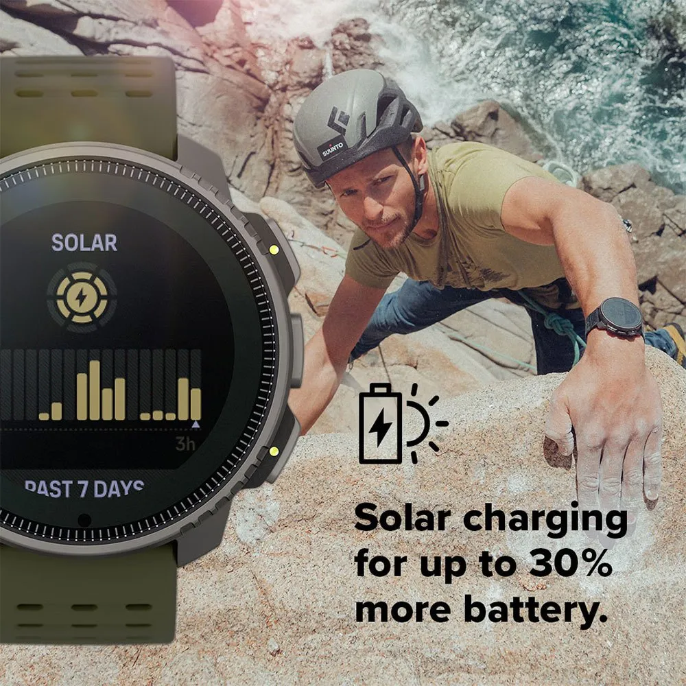 - Con Suunto Vertical non devi fare compromessi con autonomia e precisione perché offre le migliori prestazioni in entrambi i casi. La straordinaria durata della batteria fino a 500 ore di monitoraggio continuo dell'esercizio in modalità tour e fino a 60 ore nella modalità dualband GNSS più precisa, viene potenziata dalla ricarica solare nei modelli in titanio solare che forniscono almeno il 30% in più di potenza in giornate di sole. In modalità quotidiana Suunto Vertical ti accompagna per mesi senza ricarica!