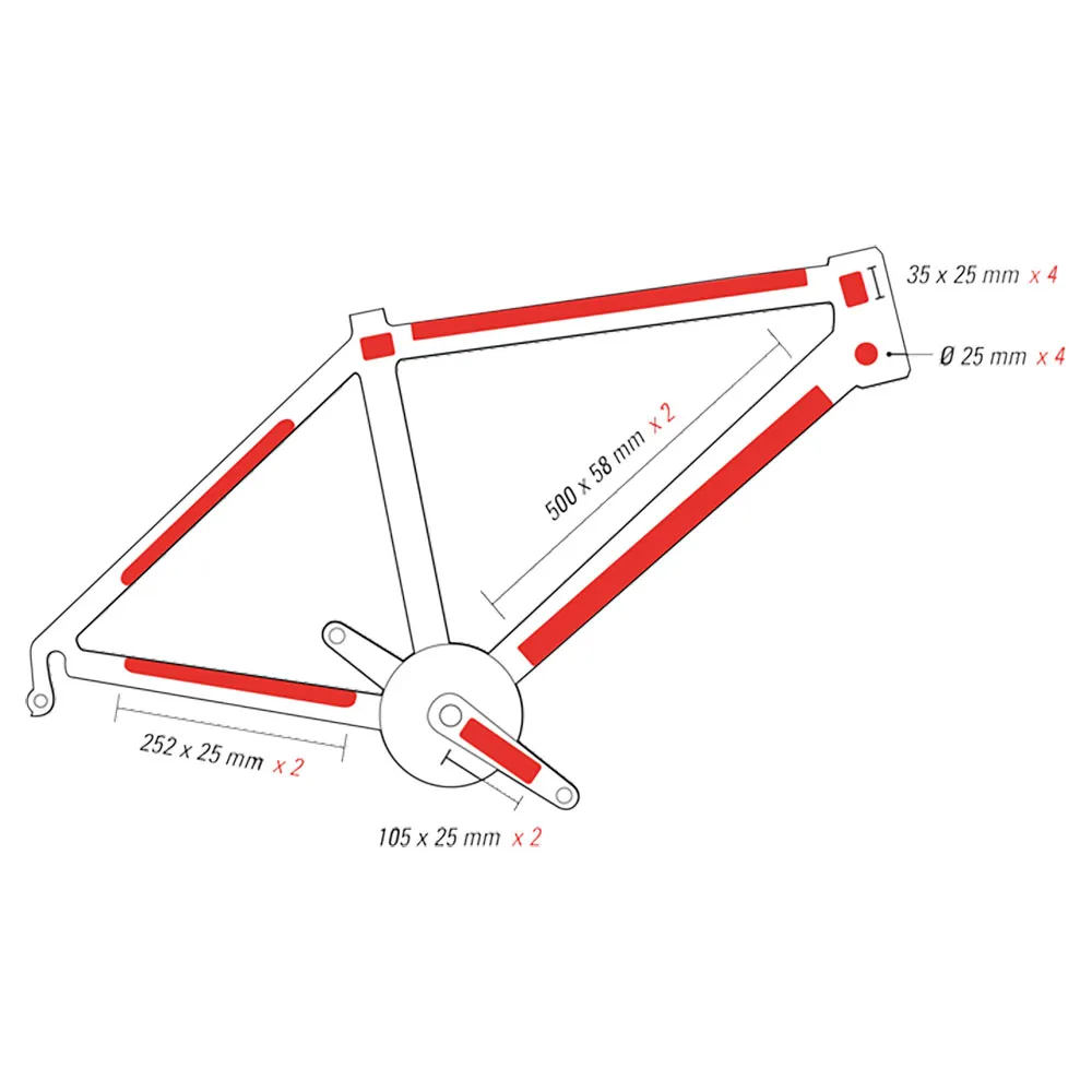 De rode markeringen die op de tekening van het fietsframe te zien zijn, zijn alle stickers die in de kit zitten.