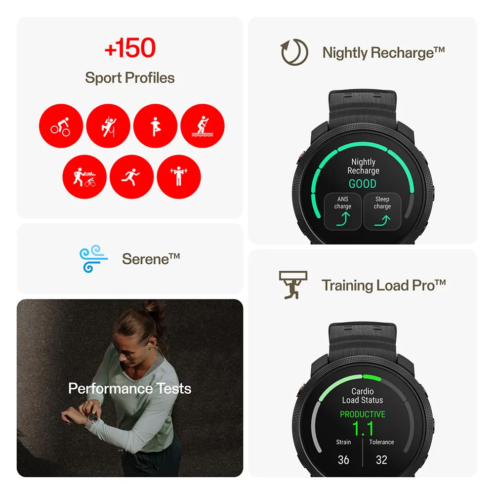 - Ytelses- og restitusjonstester: Fitness Test™; Løpetest™; Gåturer™; Ortostatisk test og Recovery Pro™. Disse testene hjelper deg å forstå ditt kondisjonsnivå, unngå overtrening eller undertrening, redusere risikoen for skader og optimalisere restitusjon.- FitSpark®: Tilpassede daglige treningsforslag og veiledning basert på brukerens nåværende fysiske tilstand og beredskap.