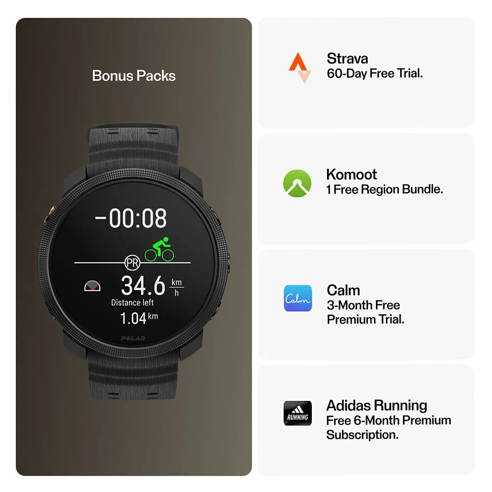 - Over 150 sportsprofiler: Med detaljerte beregninger skreddersydd for favorittsportene dine, og tilpassbare treningsvisninger tilpasset dine behov og preferanser.