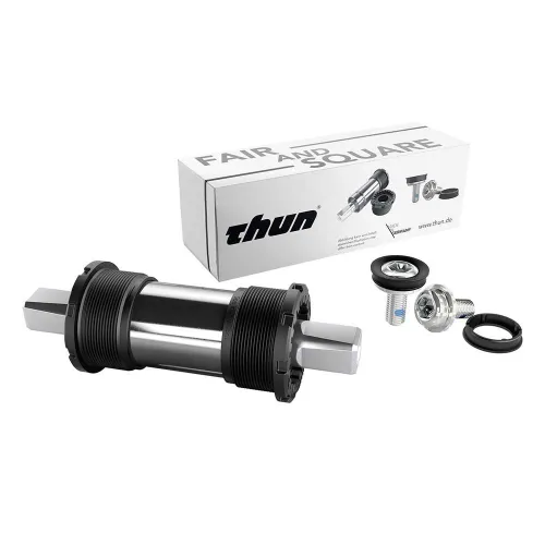 Thun bunnlager ´´Efficient Jive´´ firkant taper, BSA gjenge, inkl. 2 monteringsbolter selvbetjeningspakke, funksjonell skulder (FS) venstre, aksel laget av spesialherdet materiale med (ML-hardhet) i den europeiske standarden ISO 4210 (MTB-standard), optimal rotasjon kvalitet på grunn av dobbelt forseglet industrilager, sinkbelagt stålhylse for å beskytte bunnrammen, Durethan gjengeadapter, bolter med polyamid-flekkdeksel, monteringsnotat: skallmoment: 30Nm; boltmoment: 40Nm 113mm aksellengde.