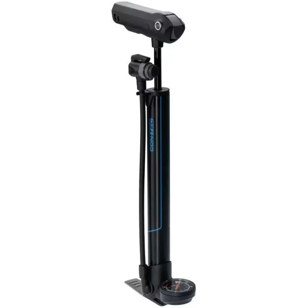 CONTEC mini pompka ręczna ´´Air Support Mini´´ 8 bar / 120 psi, pasuje do wszystkich zaworów, aluminiowa obudowa, ok. 43 cm wysokości, opakowanie samoobsługowe, ze składaną podstawą ze stali nierdzewnej, zawiera: manometr na podstawie, manometr ze wskazaniem psi i bar, ergonomiczny uchwyt T, z ruchomym wężem, potrójna głowica zaworowa (Schrader, Presta, Dunlop), zawiera: uchwyt do oczek koszyka na bidon i uniwersalny uchwyt.