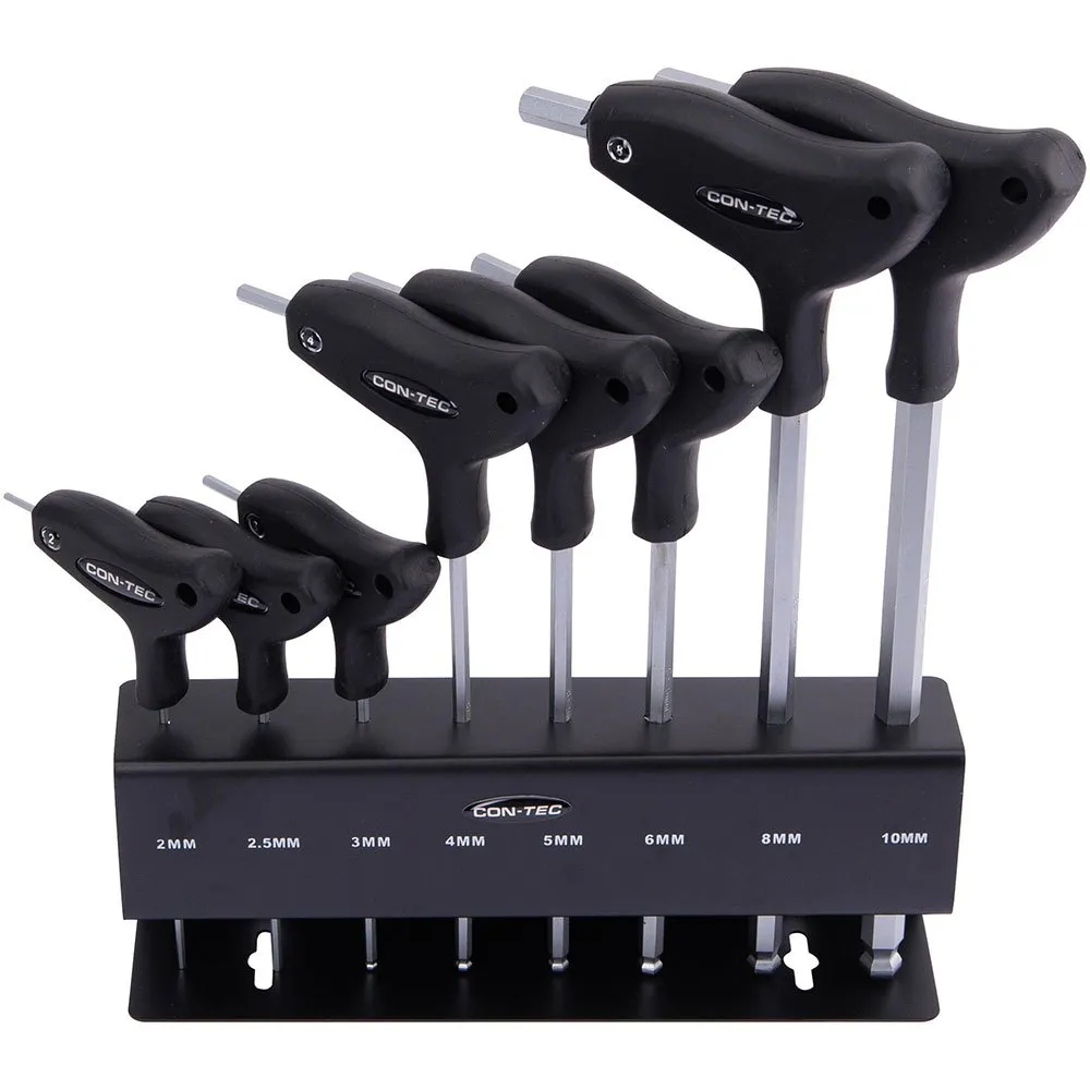 Sem a ferramenta certa, o ciclista terá dificuldades. Com o conjunto de chaves Allen de 8 peças da CONTEC, os ciclistas profissionais e amadores estão sempre equipados de forma ideal. As chaves sextavadas incluídas são caracterizadas por um design ergonômico, que permite uma ótima aderência e suporte em cada passo. As chaves individuais podem ser usadas como chaves em T com uma cabeça esférica na extremidade inferior do torque e como chaves em L para alto torque de aperto. Um suporte de parede prático também está incluído.