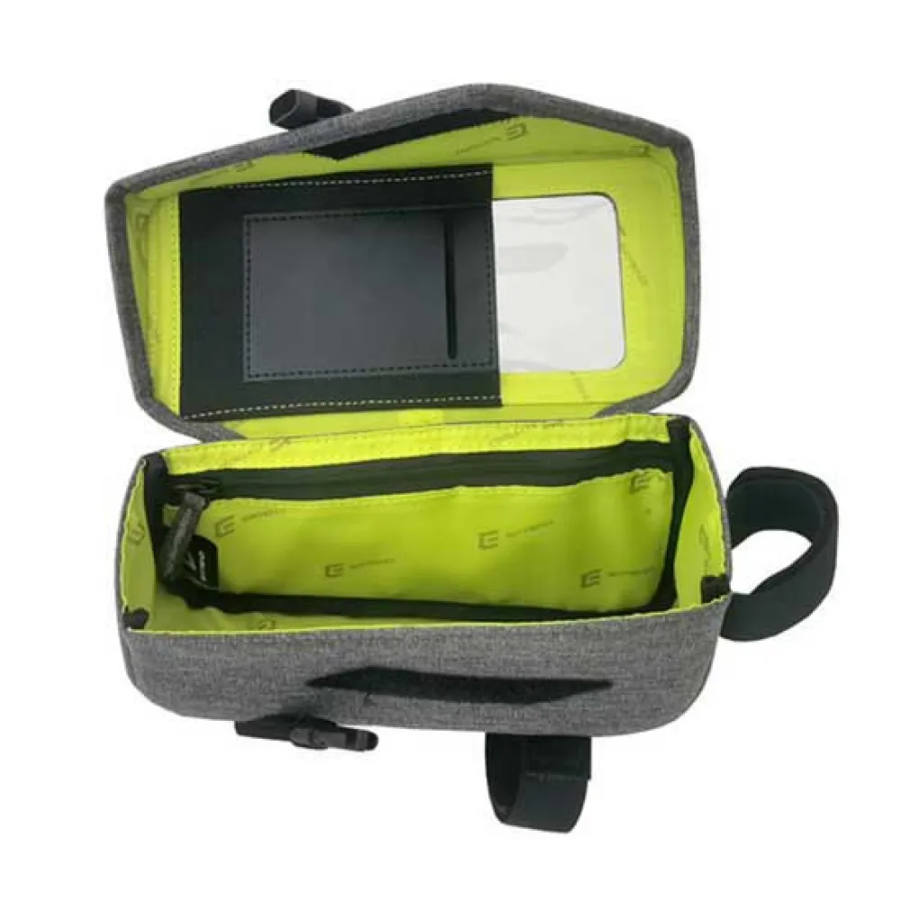 A parte superior da bolsa é presa à fivela e ao velcro. Uma folha transparente protege seu telefone da umidade e possíveis chuvas