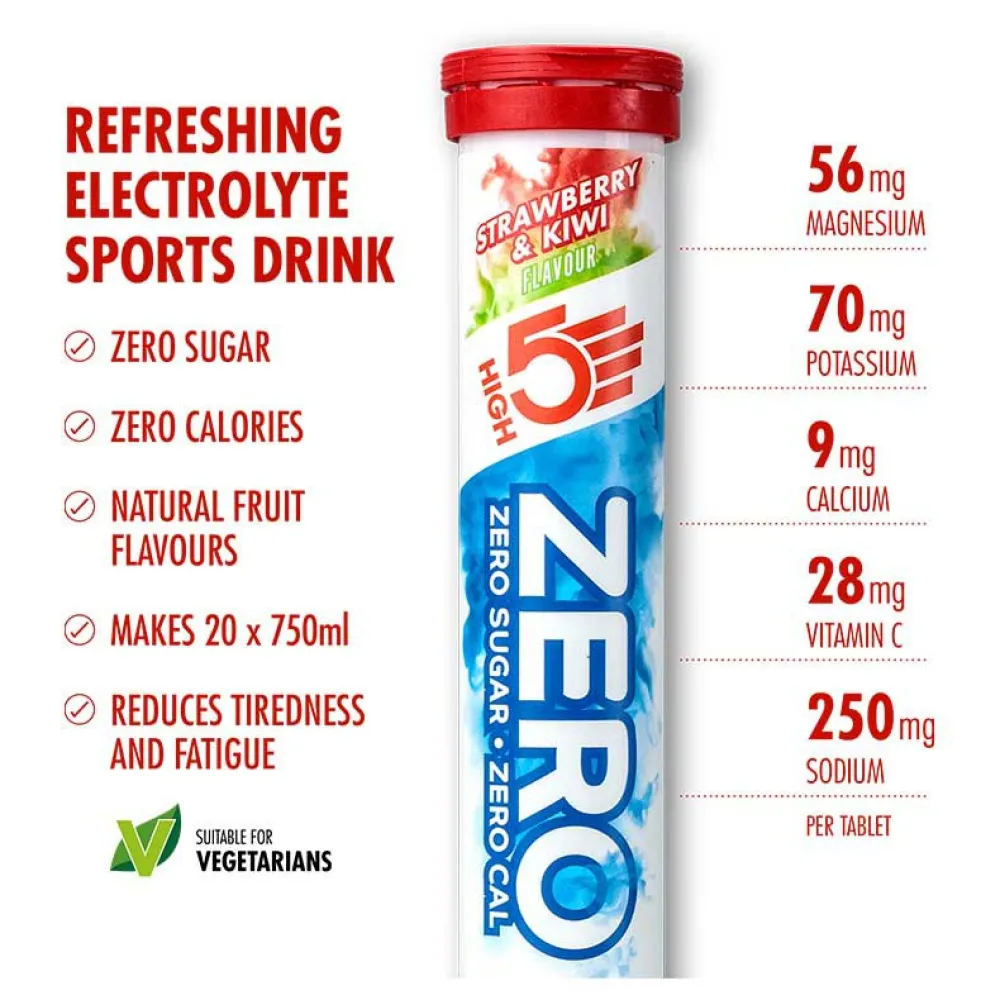 Os comprimidos HIGH5 Zero são uma forma conveniente e eficaz de repor os eletrólitos e hidratar o seu corpo antes, durante ou após a atividade física. Este pacote contém 20 comprimidos com sabor a morango e kiwi que podem ser dissolvidos em água para criar uma bebida refrescante e saborosa.