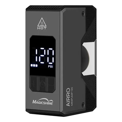 O mini compressor Magicshine Airro possui um motor elétrico potente e sem escovas, capaz de inflar pneus até 120 PSI.