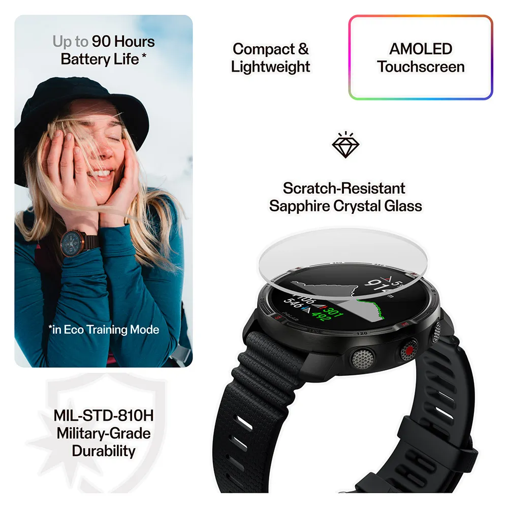 - Bateria de ultra longa duração – 30h no modo Performance, 90h no modo Eco e até 7 dias no modo Smartwatch.